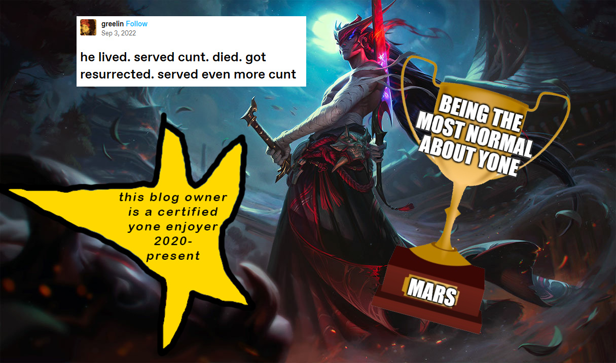 08. behind the mask : whew — hey , hi . i’m mars ( he / they ) , a yone main ( derogatory ) that’s been trapped on league of legends since s4 . yone re-wired my brain when he got released back in 2020 . outside of this blog , i balance work and school , my special blend of autism and bpd , as well as other commitments and hobbies . my ims are always open and my posts are free to be interacted with . i love when people comment on my posts and encourage that as a way to start interacting with me as a person ! i know all of this was a lot to read , so if you've managed to get to the end , i thank you for your patience while reading all of this !